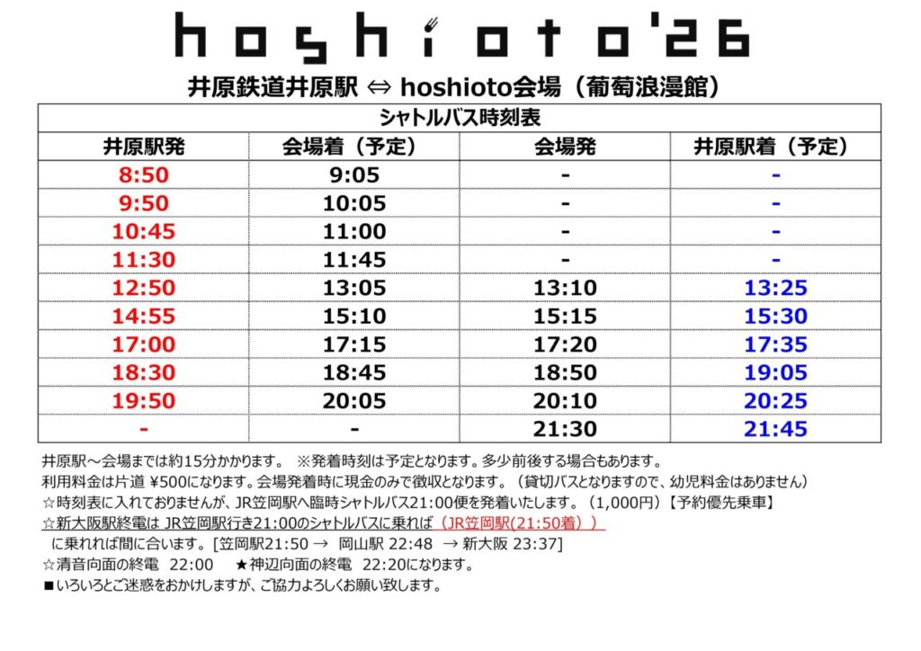 車でご来場も可能で(無料駐車場あり)、公共交通機関を利用し、hoshiotoが準備するシャトルバスでご来場する事も可能です。
