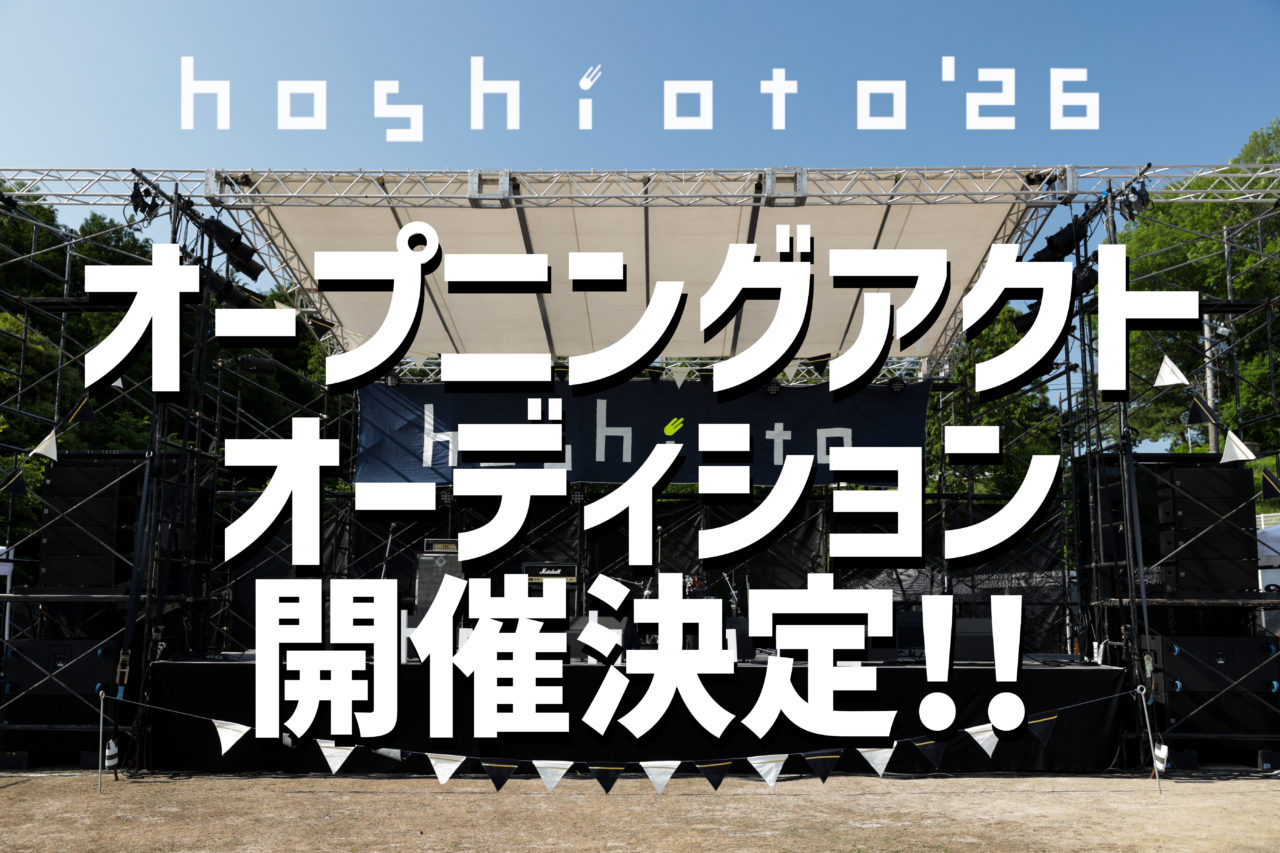 hoshioto'26 のオープニングアクトとしての出演者を今年も募集します。2026年も新しい出会いをhoshiotoは求めております!! 今年は音源審査+ライブ審査を予定しております! 詳しくはこちらからご確認ください!お待ちしております!! オーディション開催について -